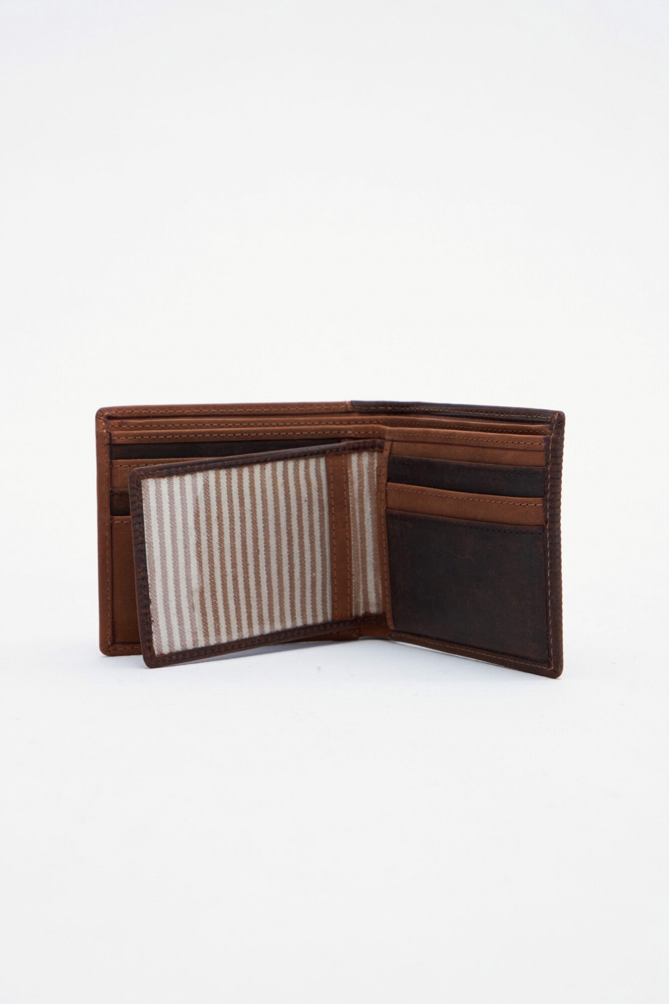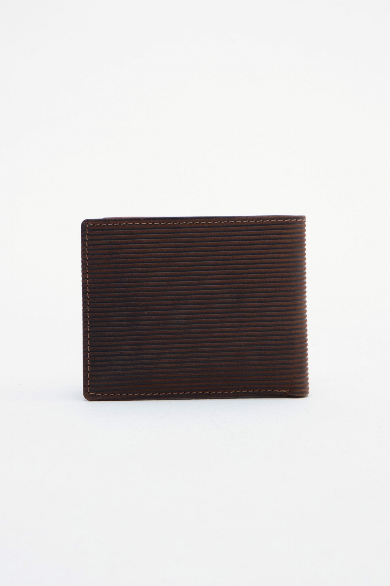 Billetera de cuero con corte y cuero con diseño de rayas. Interior con reparticiones y porta documentos extraible. Forro bolsillos en algodón.
