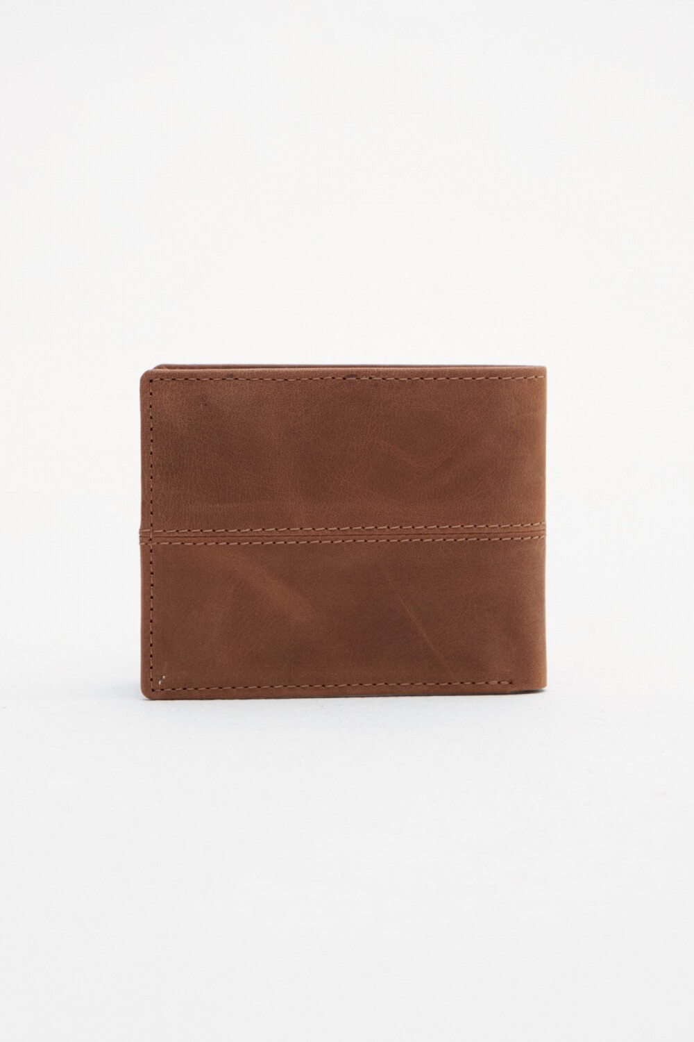 Billetera de cuero con corte, cambio de cuero y pespuntes decorativos. Interior con reparticiones. Forro bolsillos en algodón.