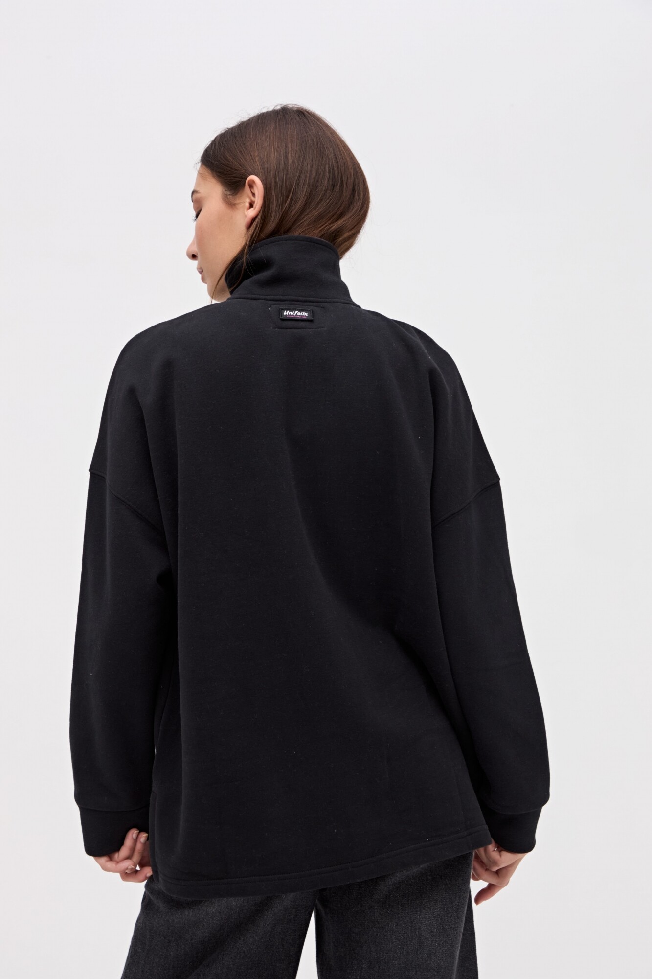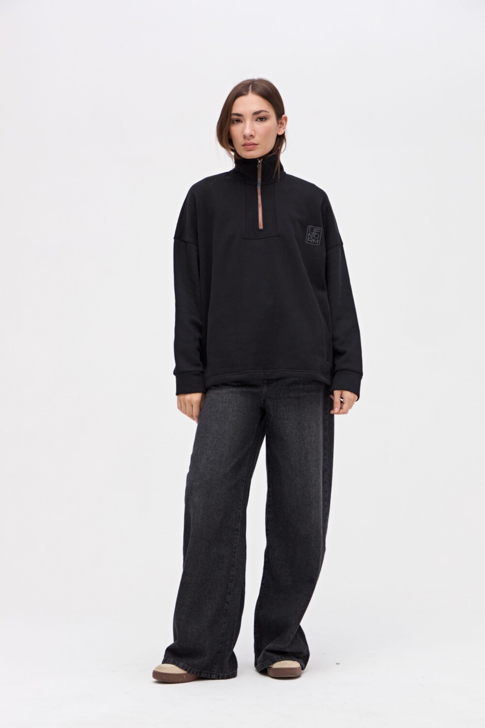 $ 2.117Buzo medio cierre en felpa con friza. Cierre metalico con detalle de corte en cartera. Tajos laterales con largo trasero tapando la cola. Bolsillos laterales. Calce oversize.