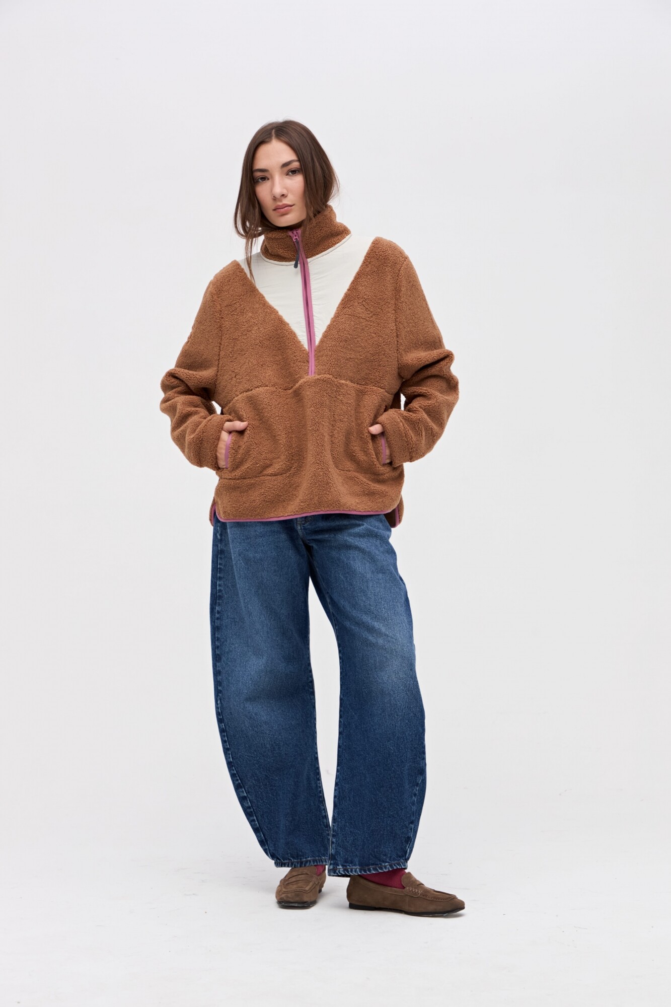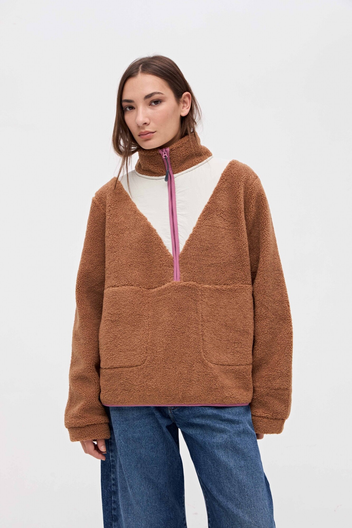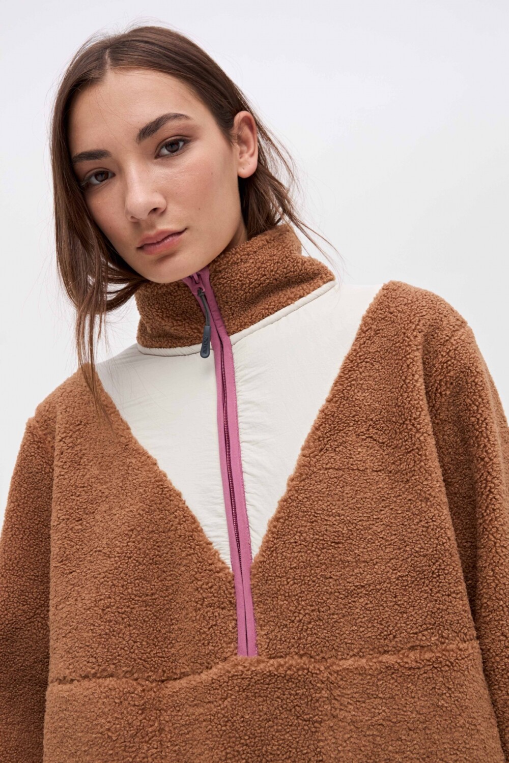 $ 2.372Buzo con medio cierre en sherpa doble faz. Corte en cuerpo con nylon de alta calidad a contratono. Detalles en prenda de vivos en nylon. Medio cierre plástico y bolsillos laterales con vivo en nylon. Bordado en manga.
