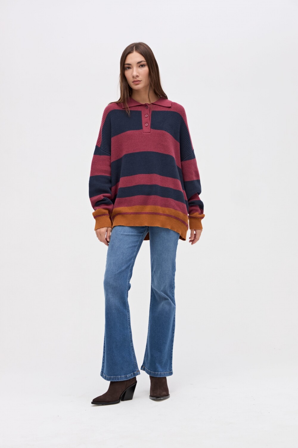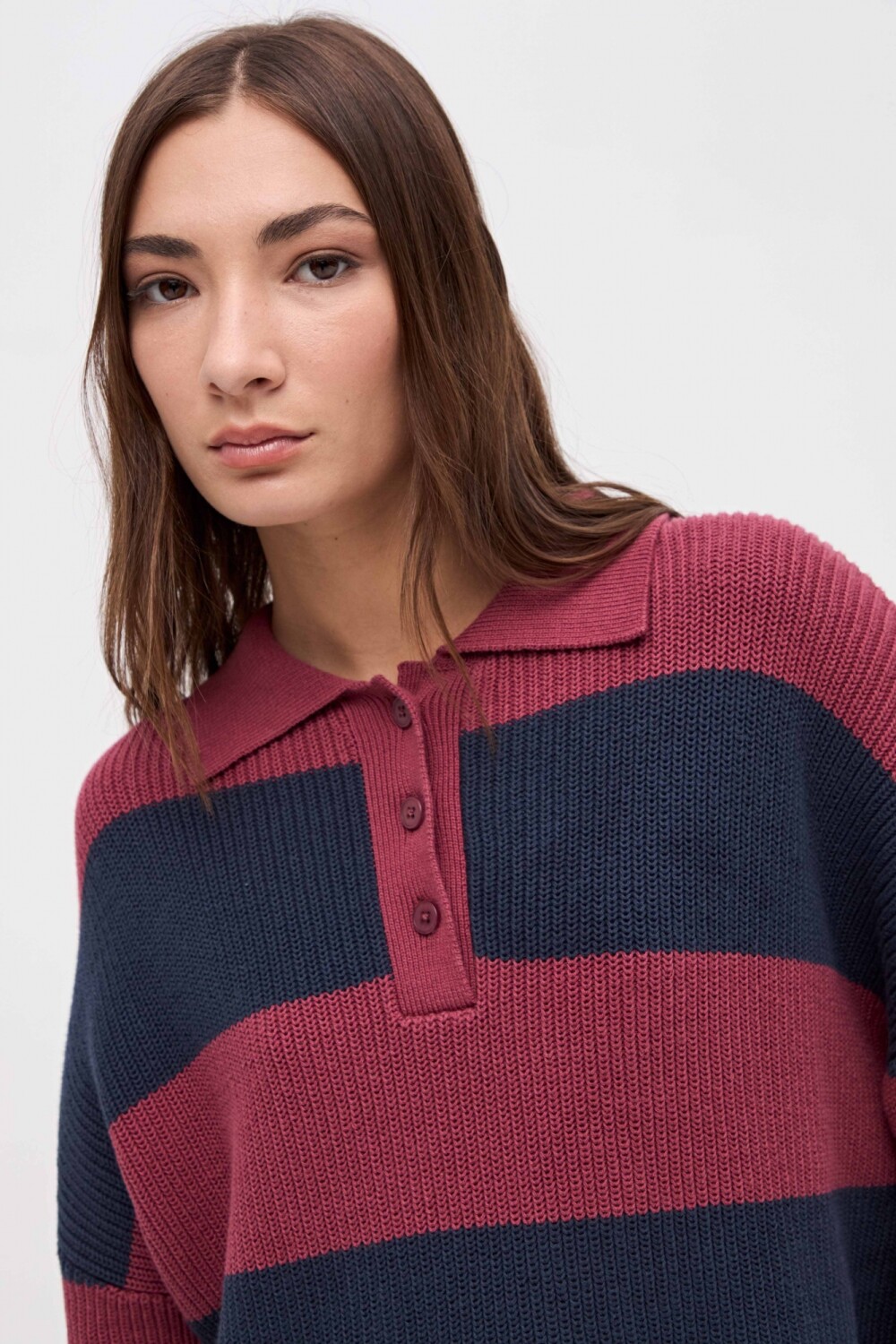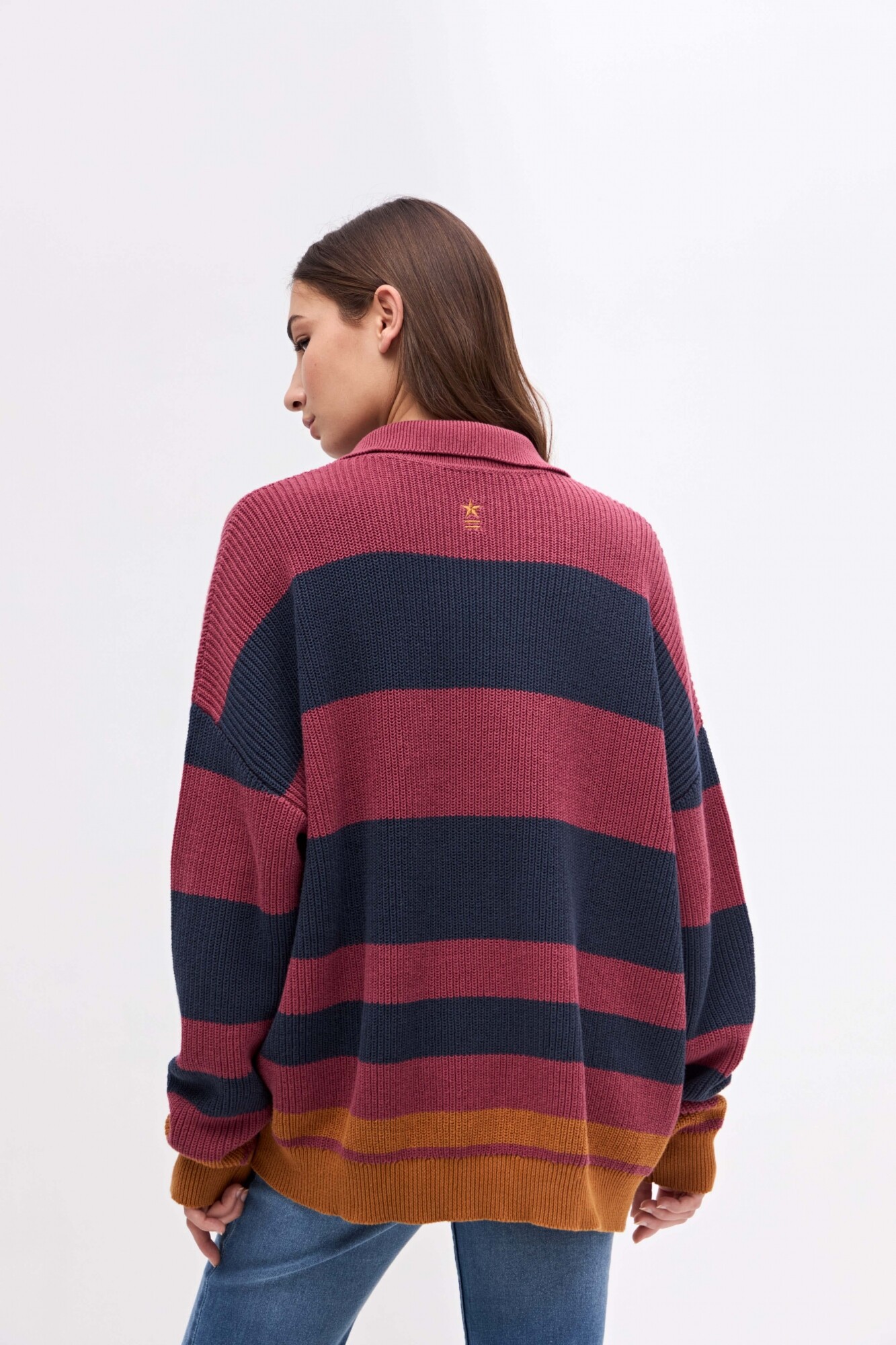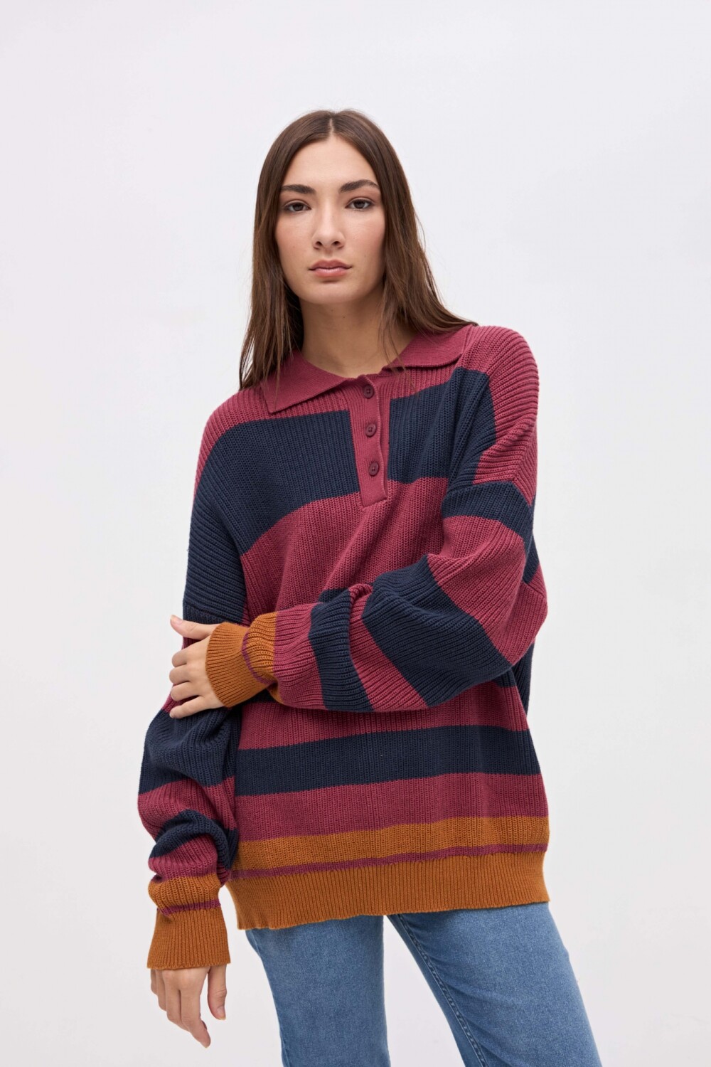 $ 2.882Polo tejida con cartera de botones y cuellito. Diseño de rayas en bloque. Bordado de marca en espalda. Calce holgado.