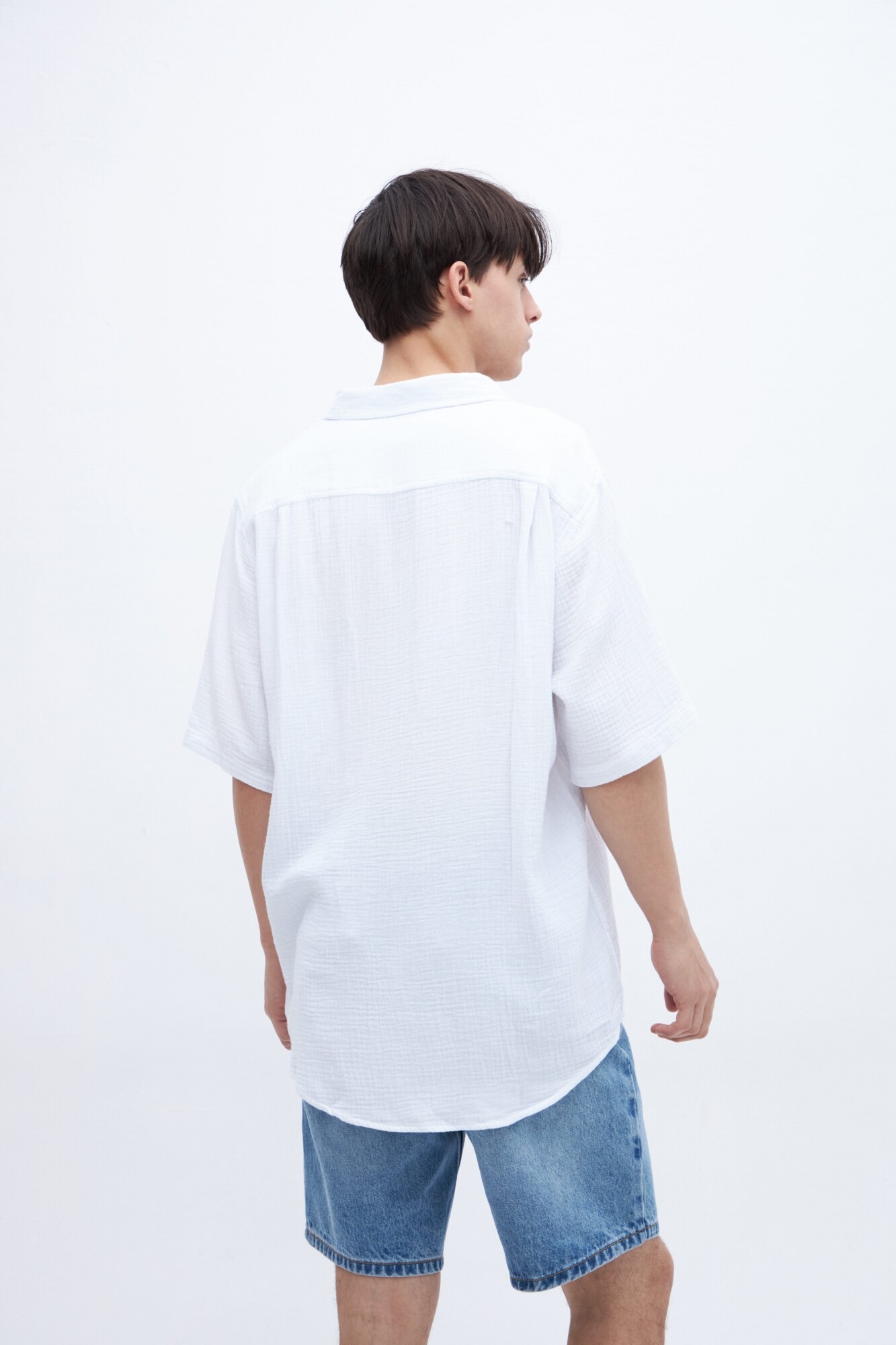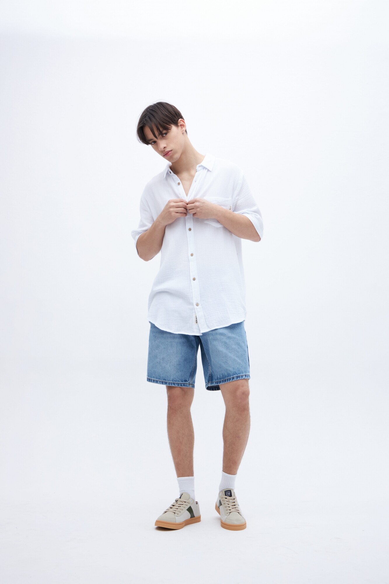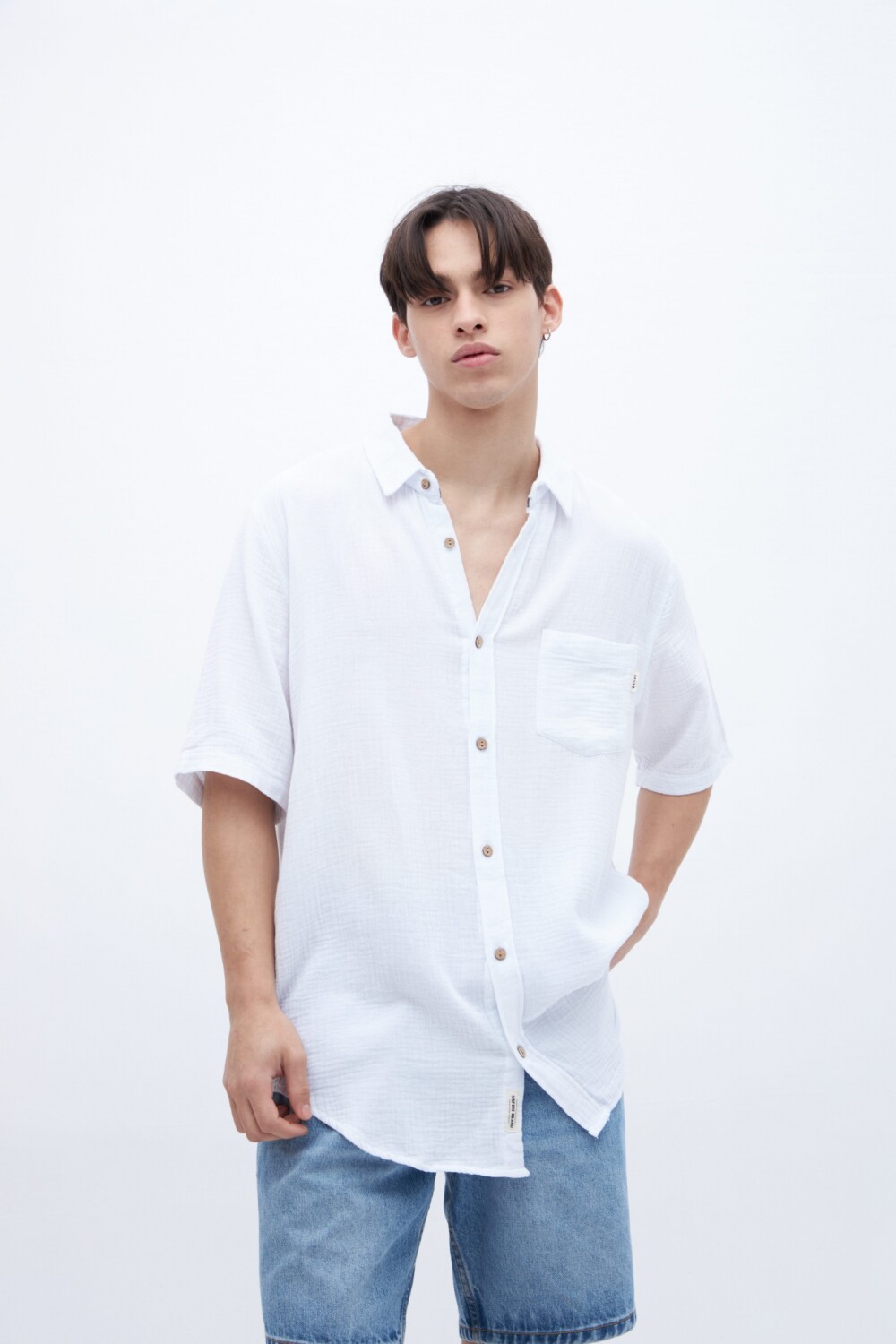 Camisa regular fit, con manga corta. Cuello solapa clásico y bolsillo en pecho. Botones personalizados.