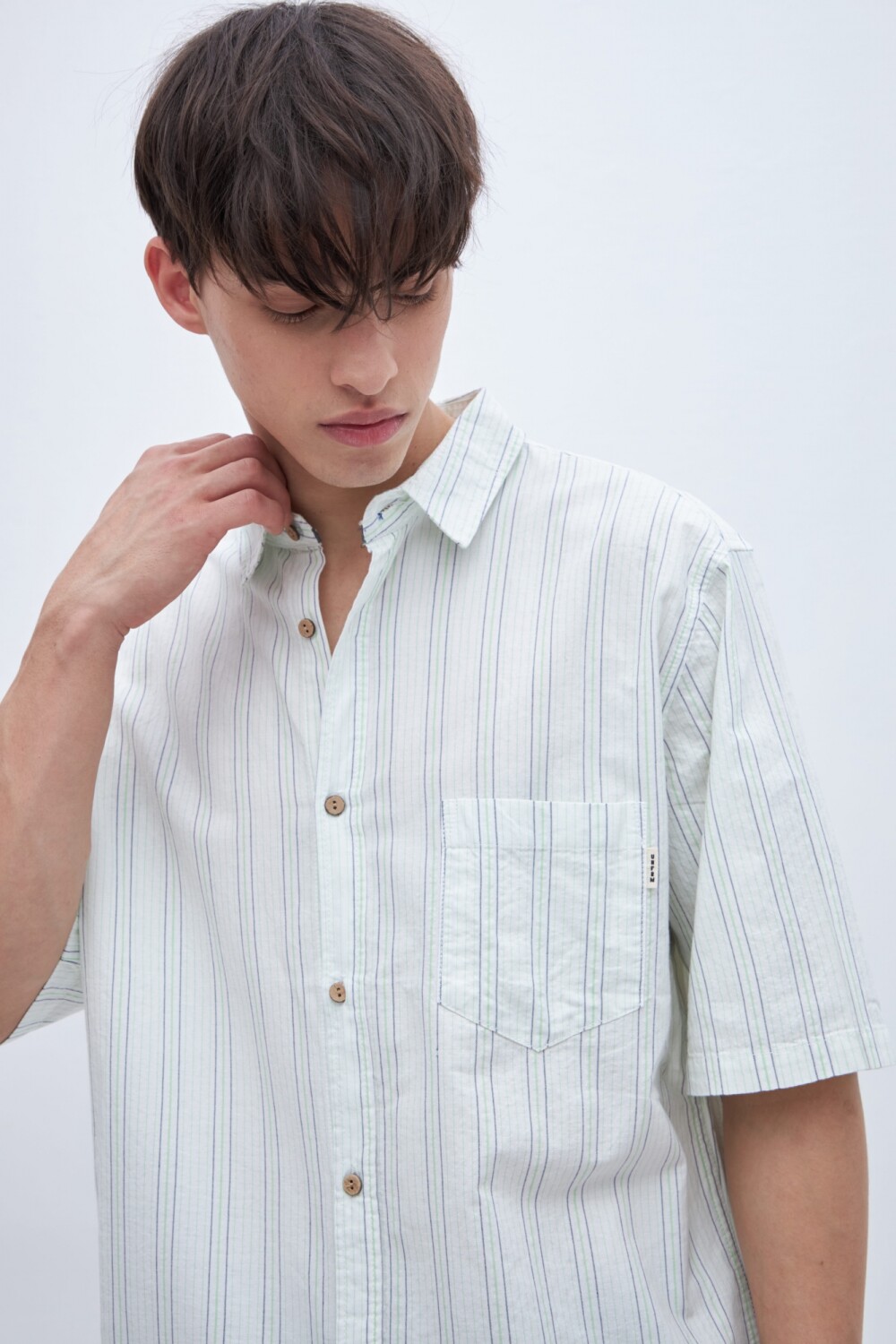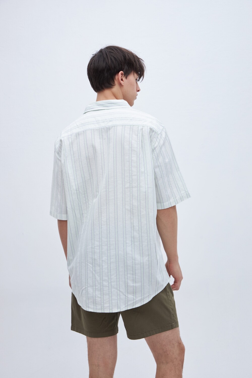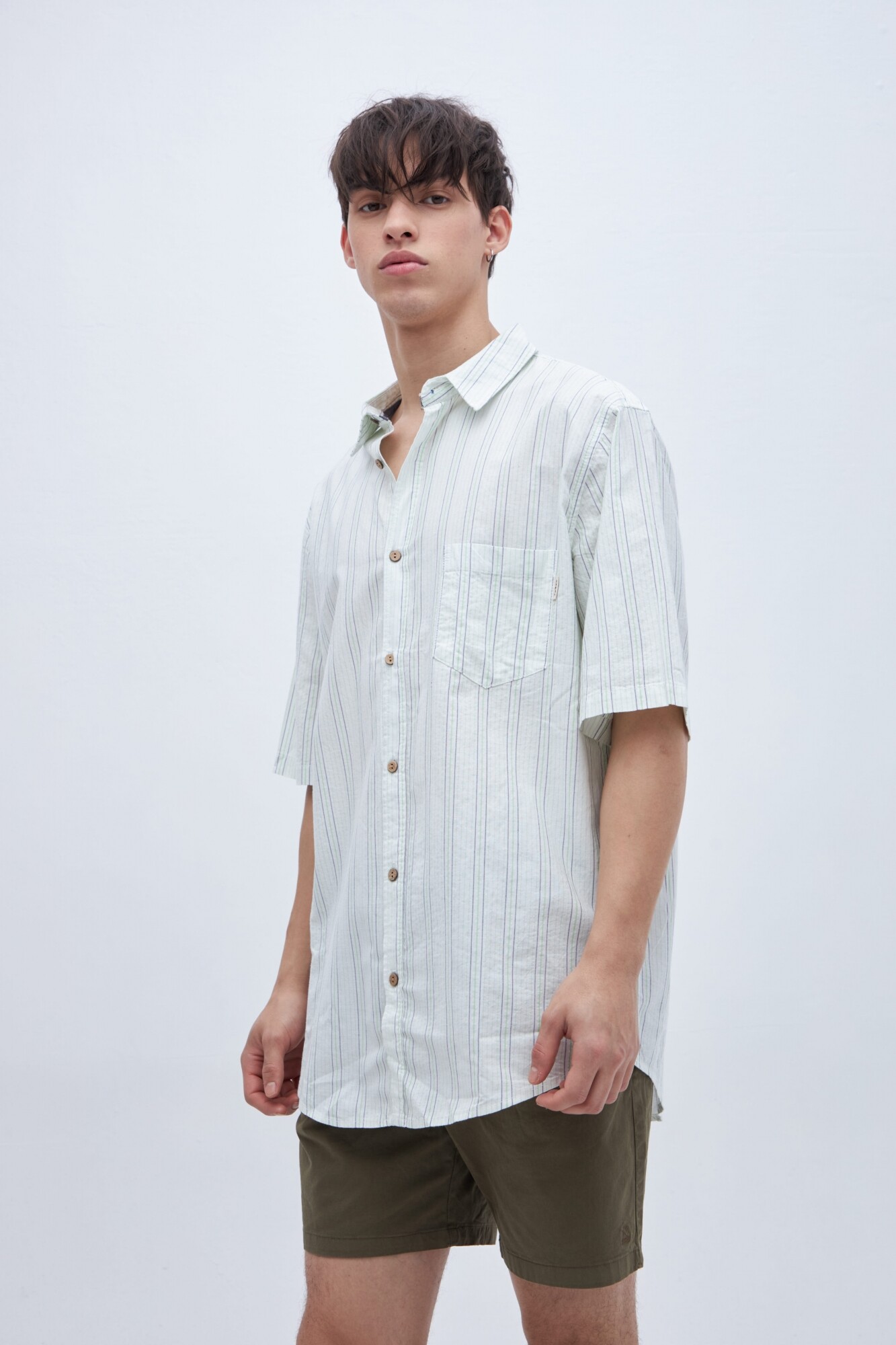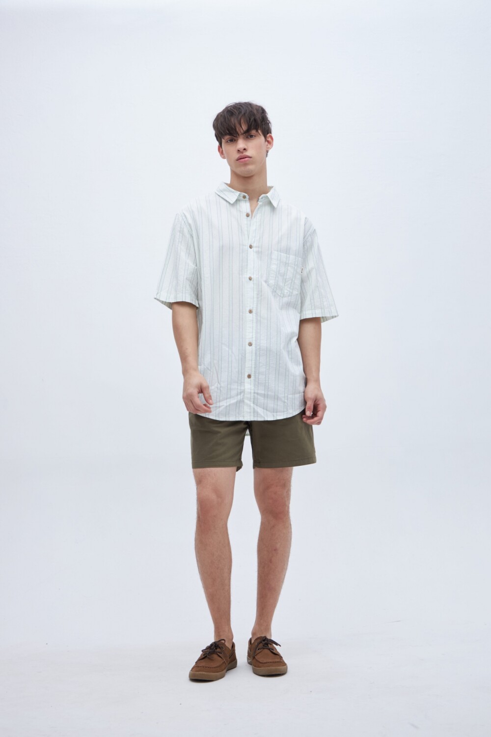 Con manga corta. Cuello solapa clásico y bolsillo en pecho. Botones personalizados.
