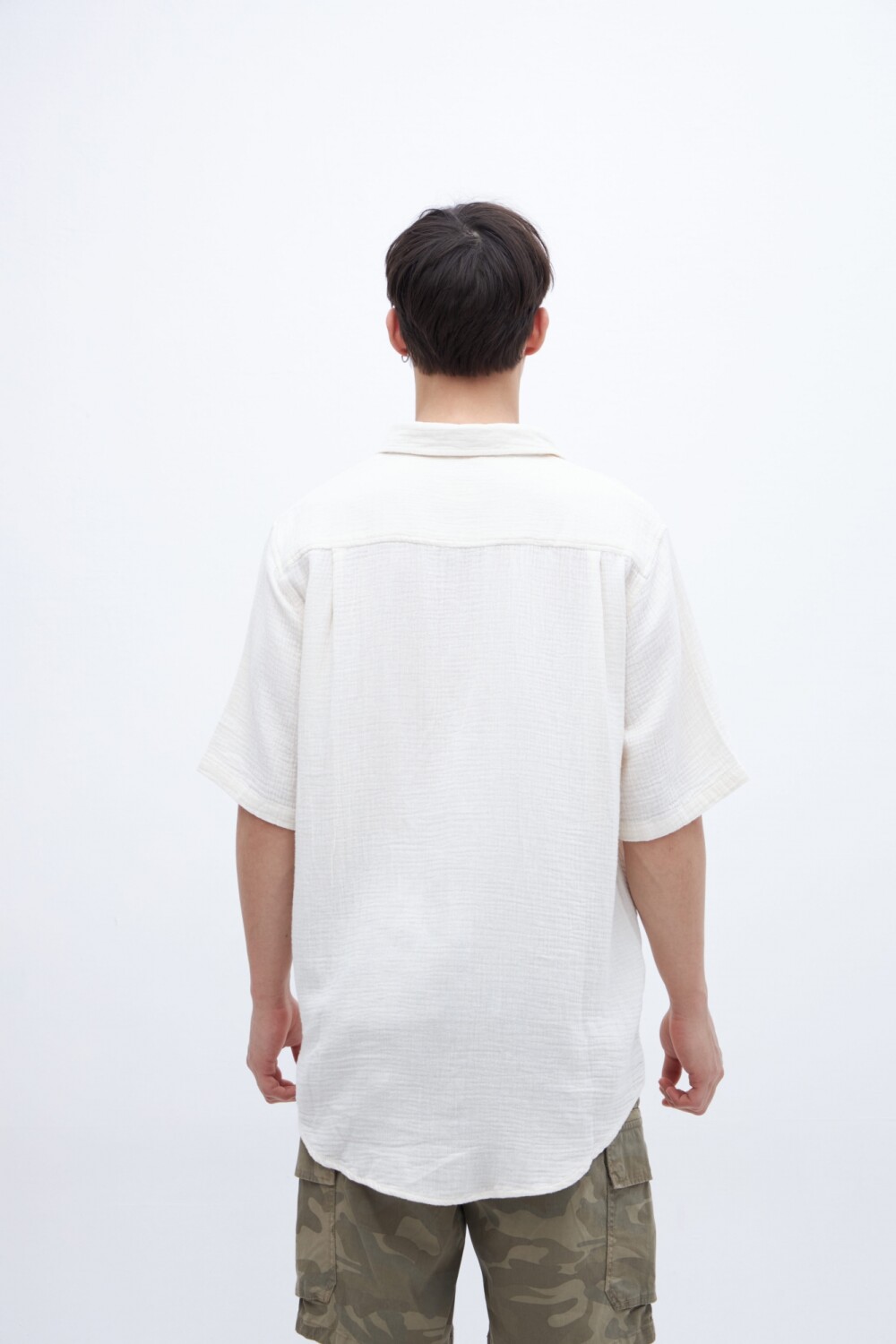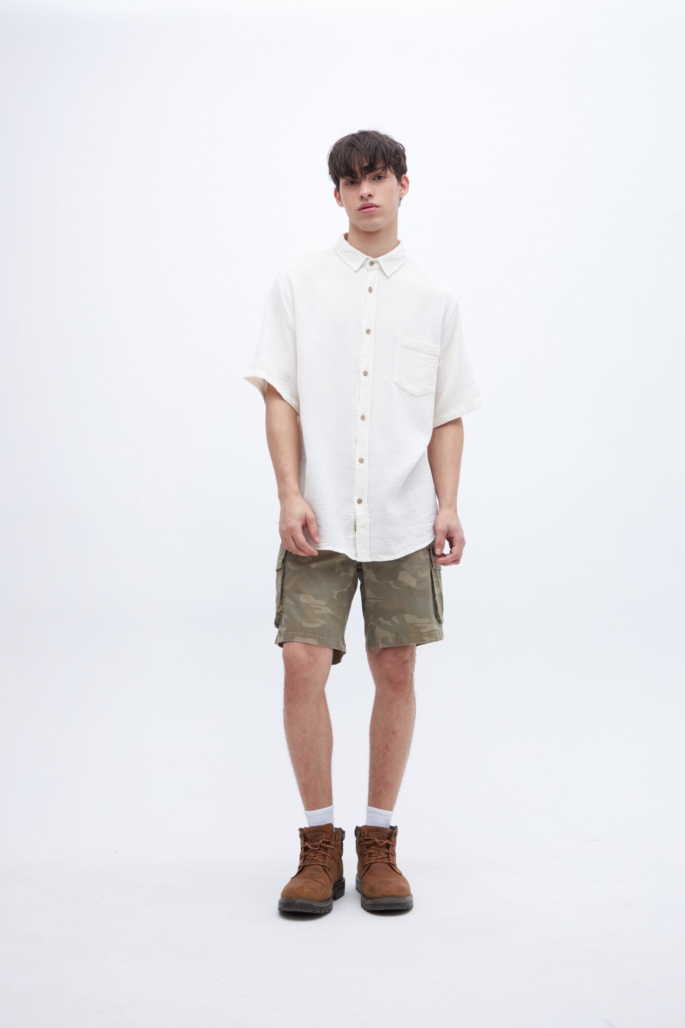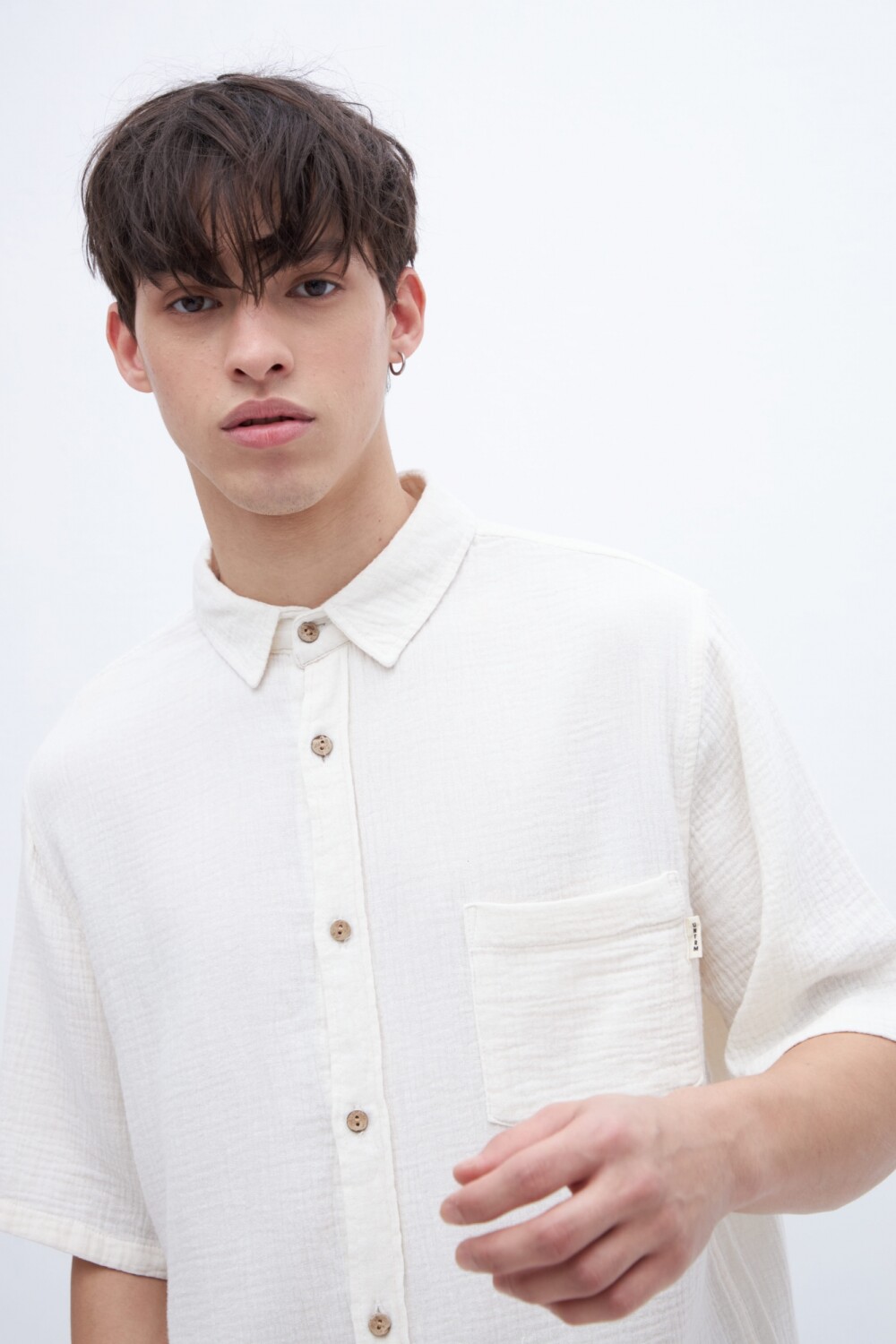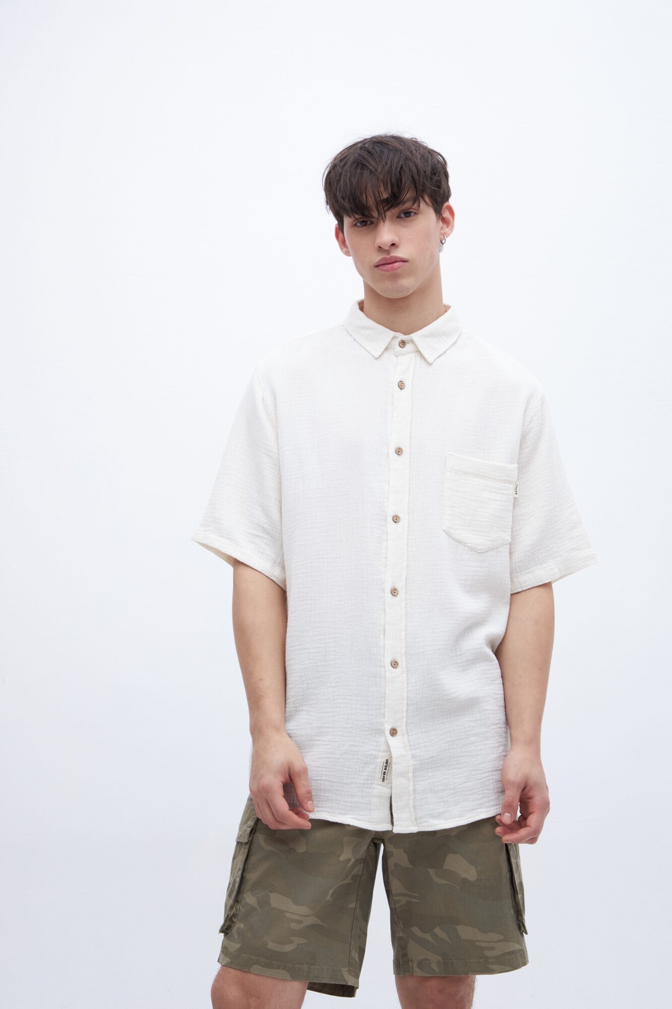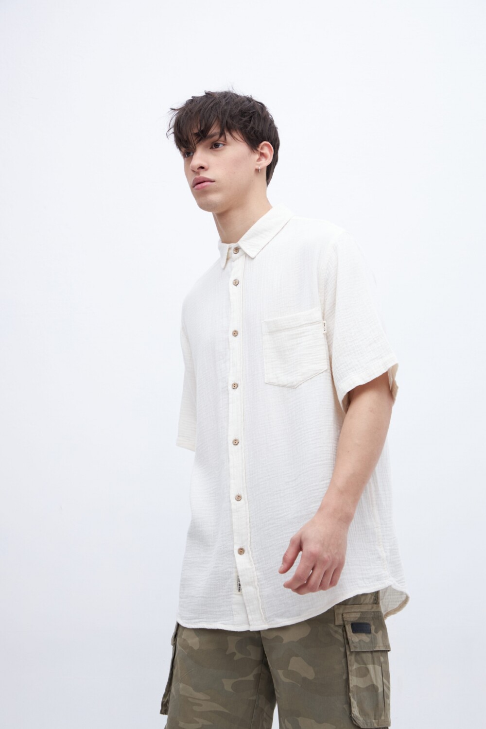 Camisa manga corta, en tela de algodón. Cuello solapa clásico y bolsillo en pecho. Botones personalizados. Calce relaxed.