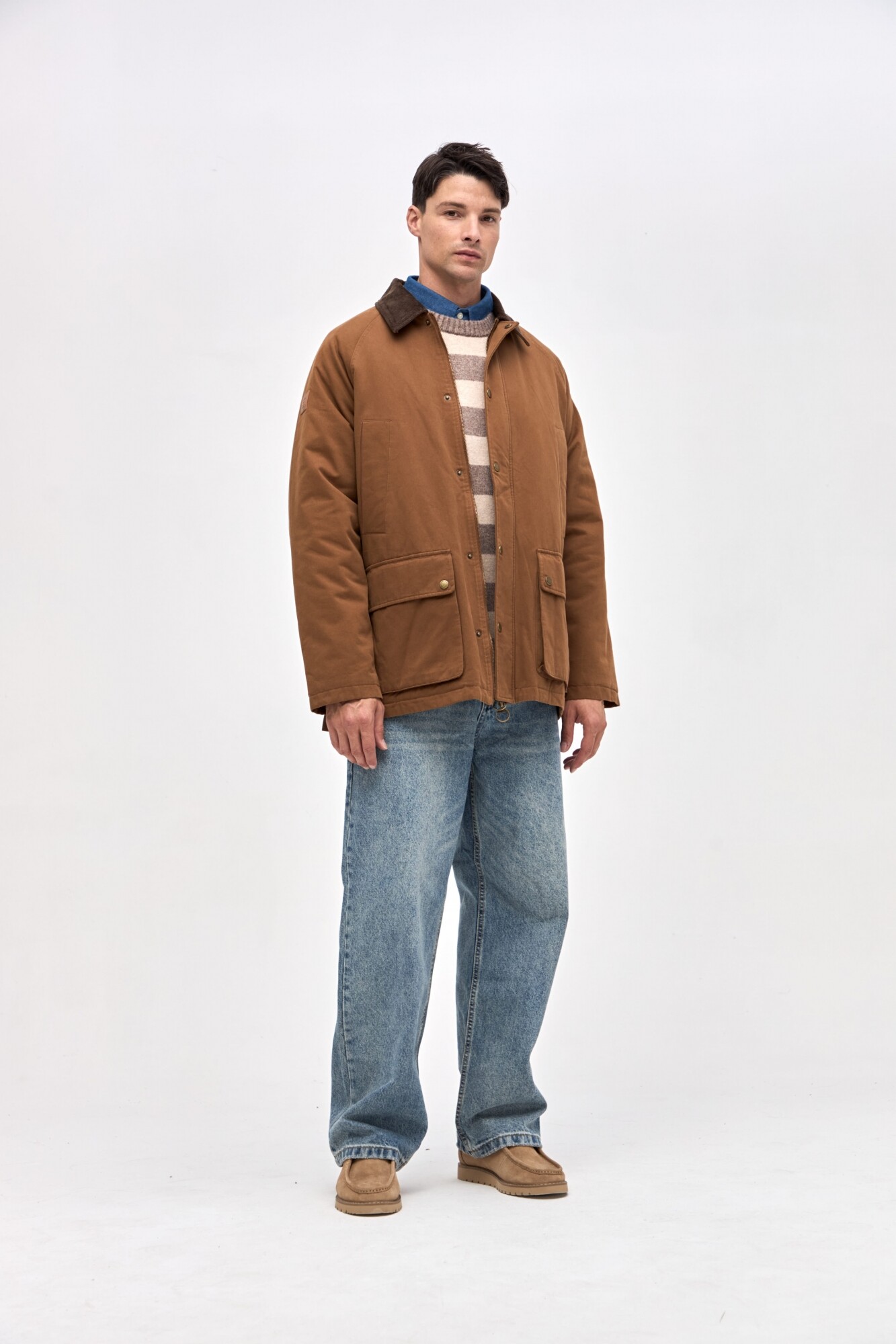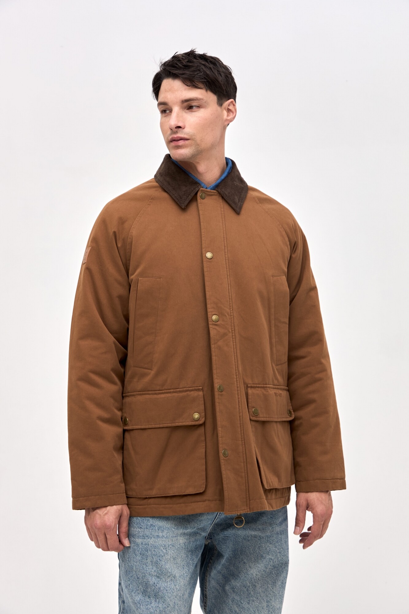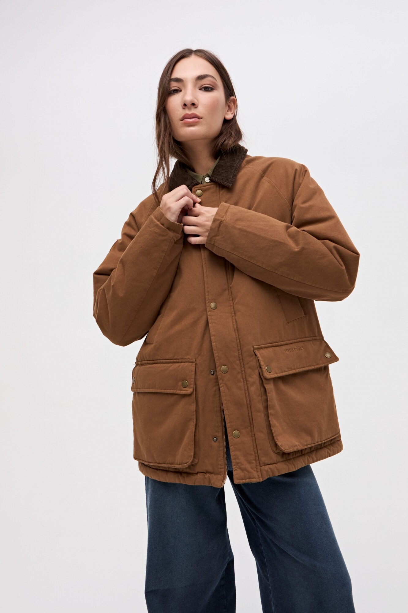 $ 3.817Campera unisex en gabardina con cuello combinado en pana. Interior capitoneado en nylon. Bolsillos en pecho y laterales con solapa. Cartera central con cierre y botones a presión personalizados. Calce clásico.
