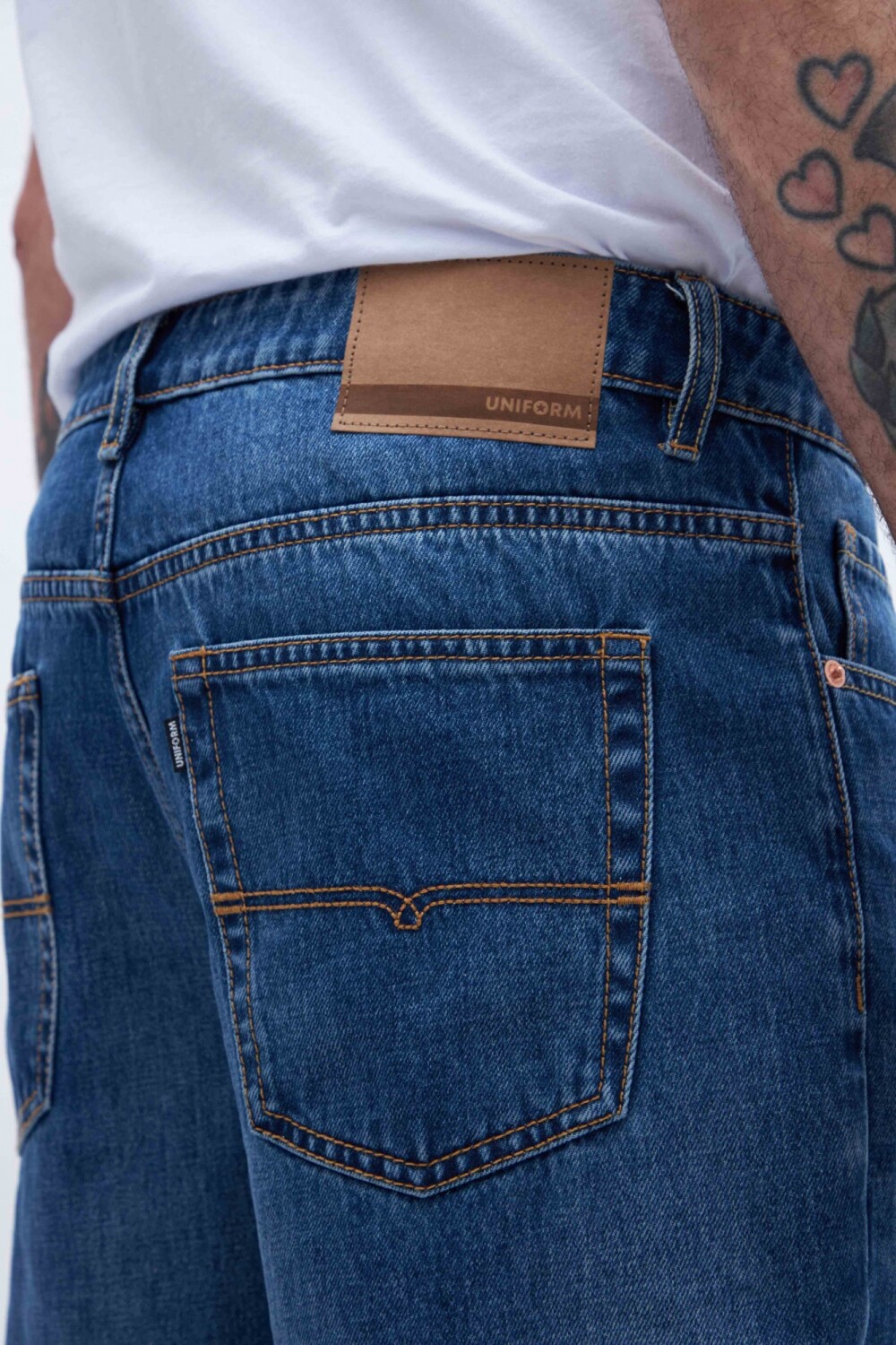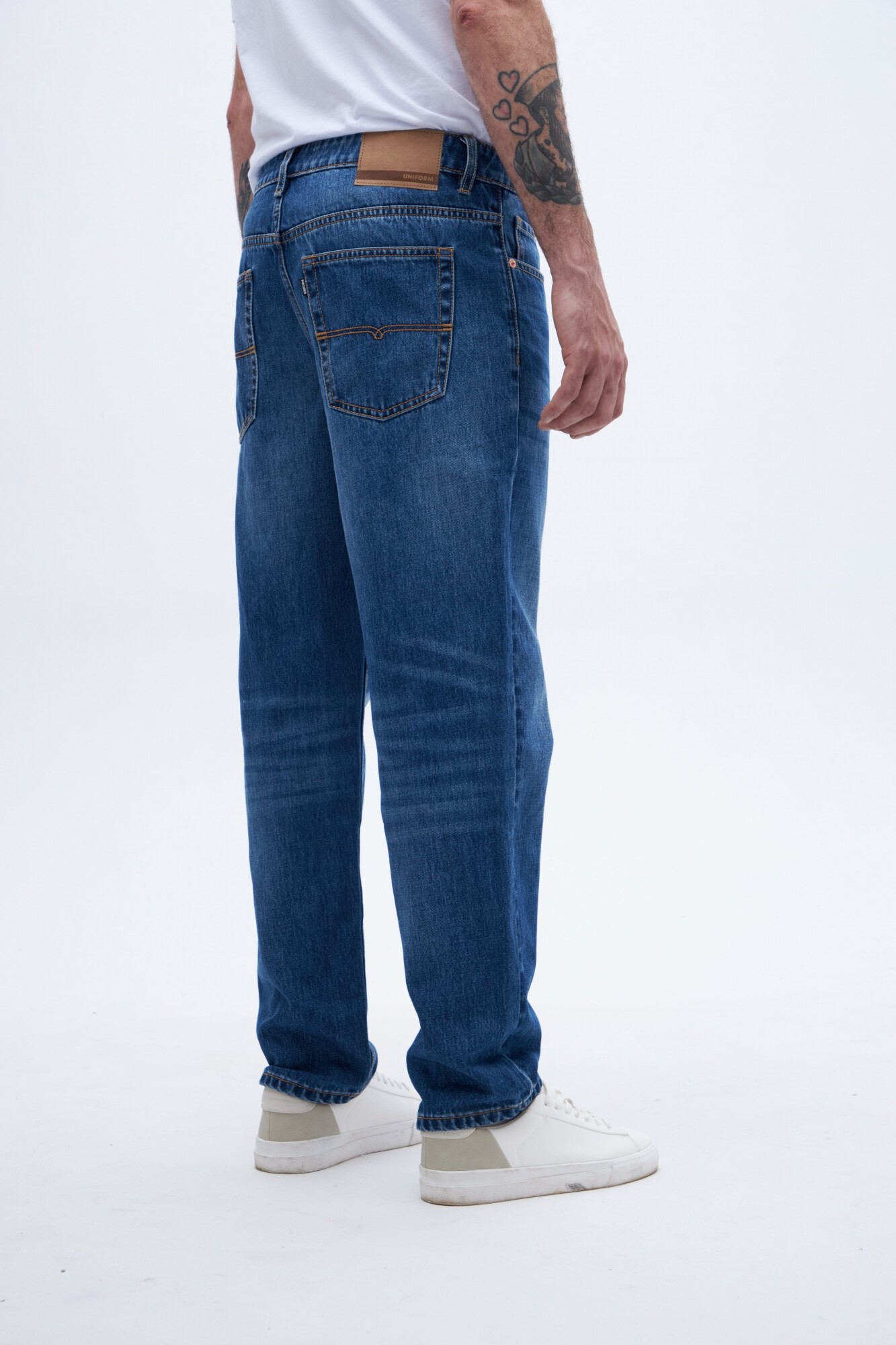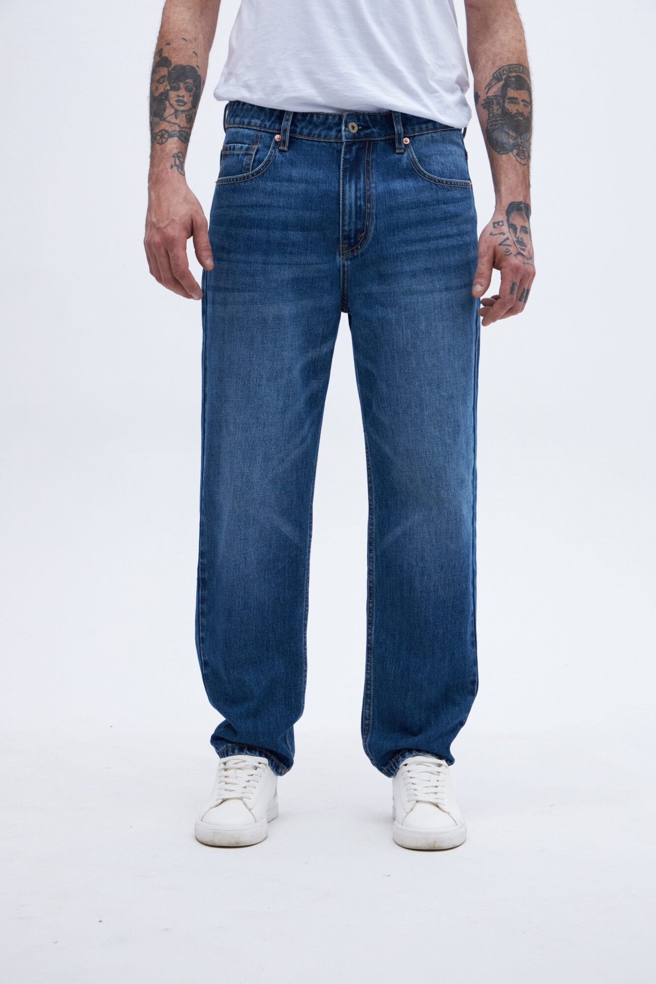 Jean holgado en cadera y leve ajustado en piernas. Tiro medio.