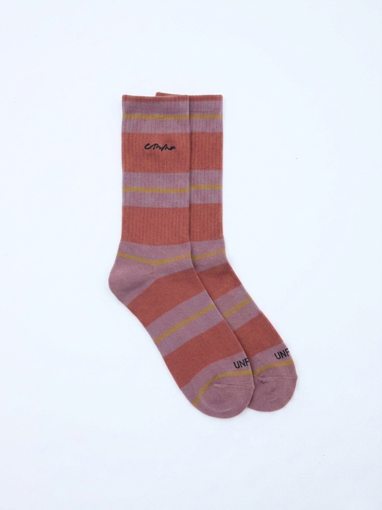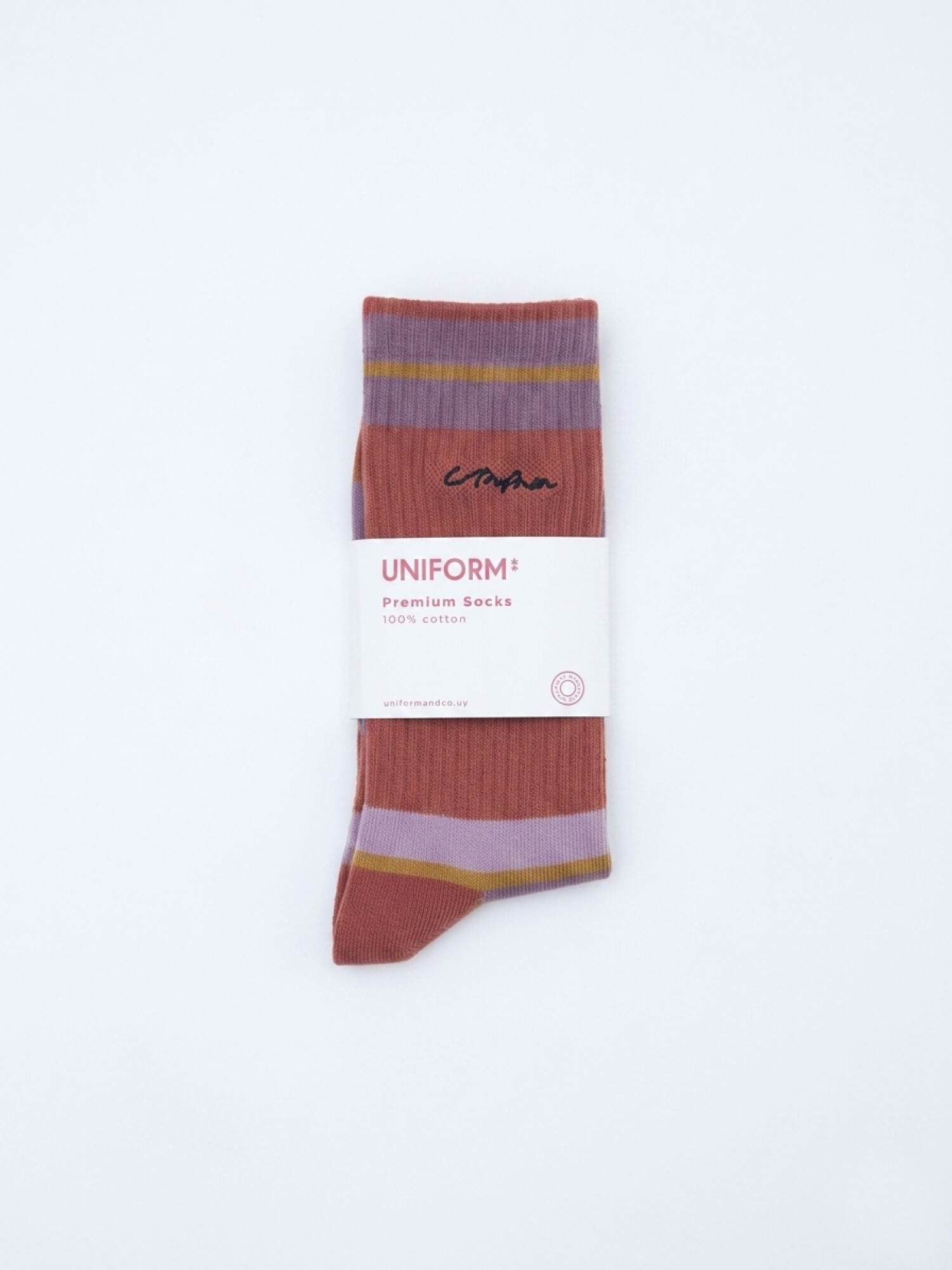 $ 417Media de caña media con bordado de logo, diseño de rayas y detalles contratono.