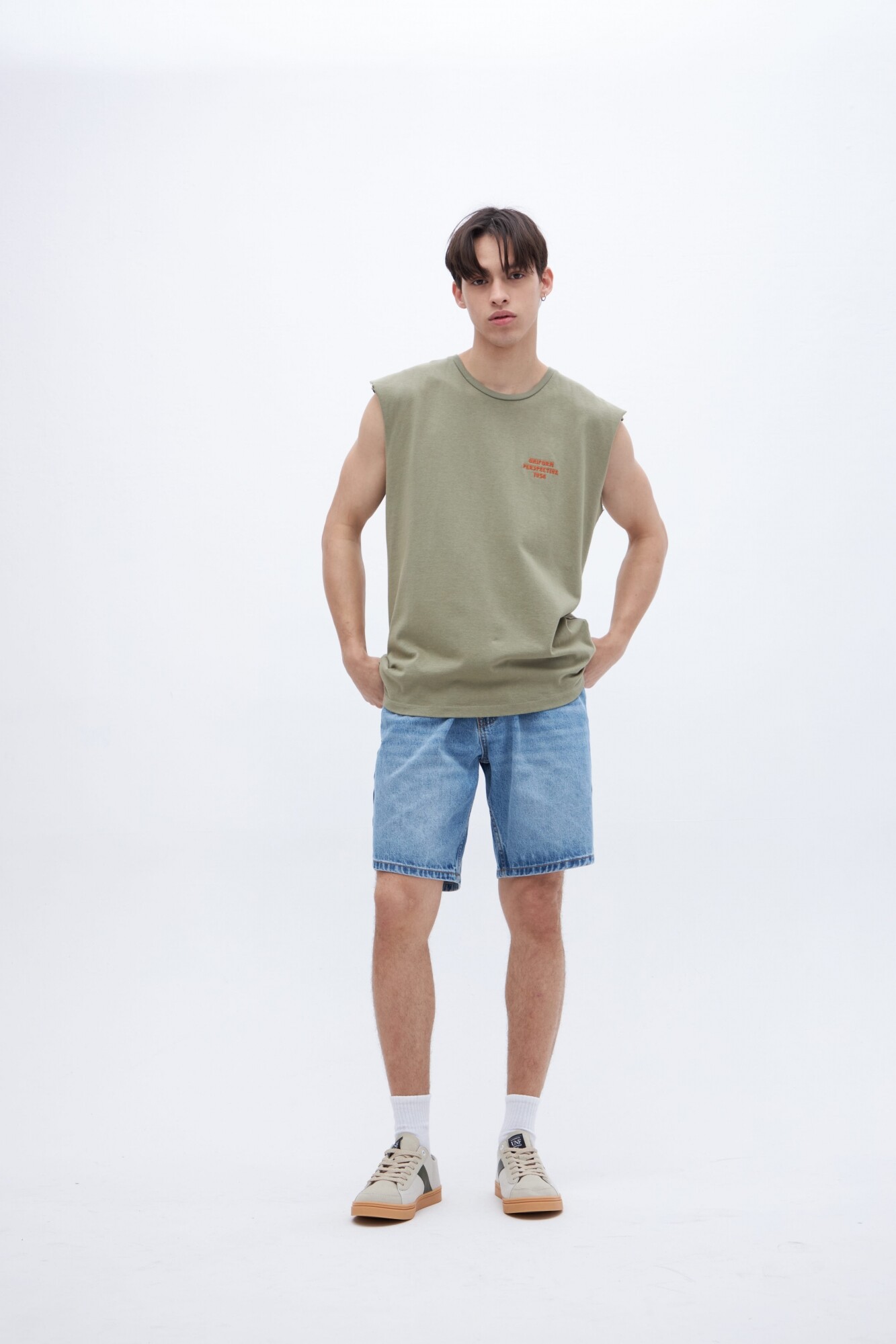 $ 903Musculosa teñida en prenda con arte en pecho. Algodón lavado con textura extra suave. Tela jersey pesado.