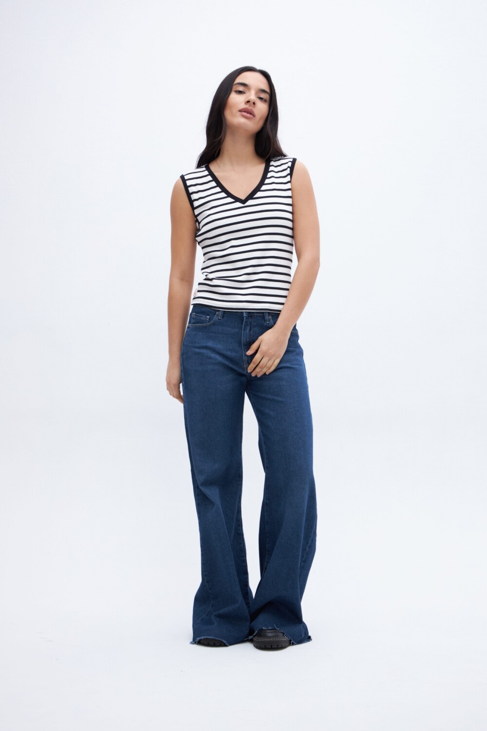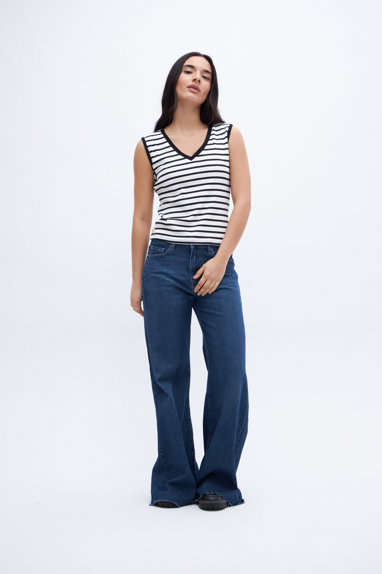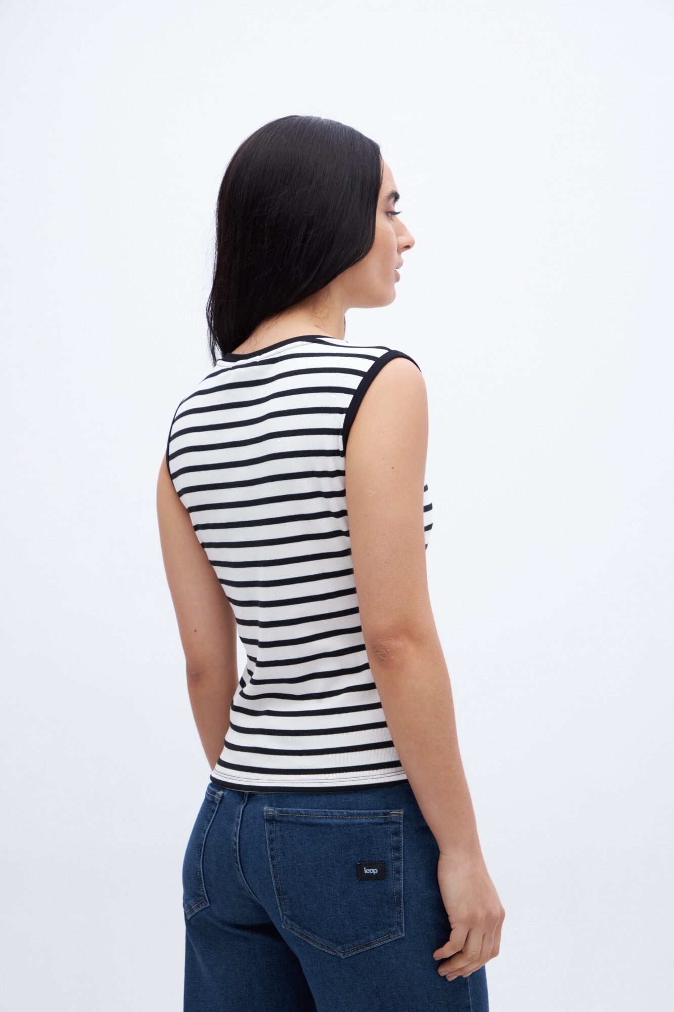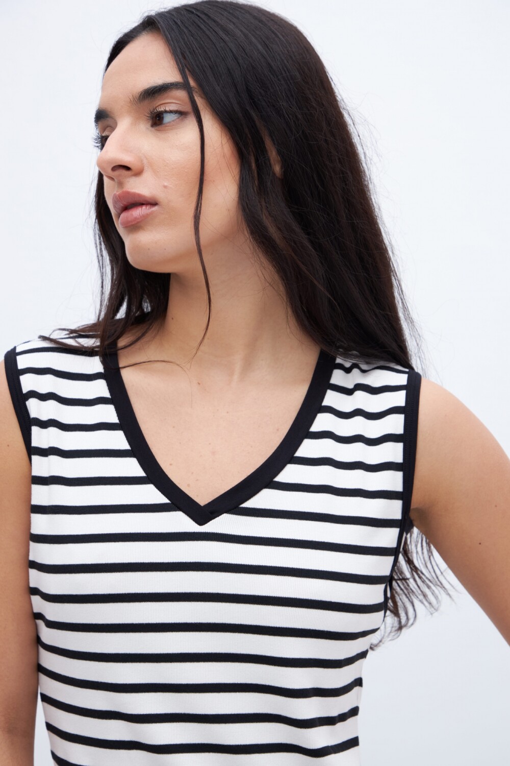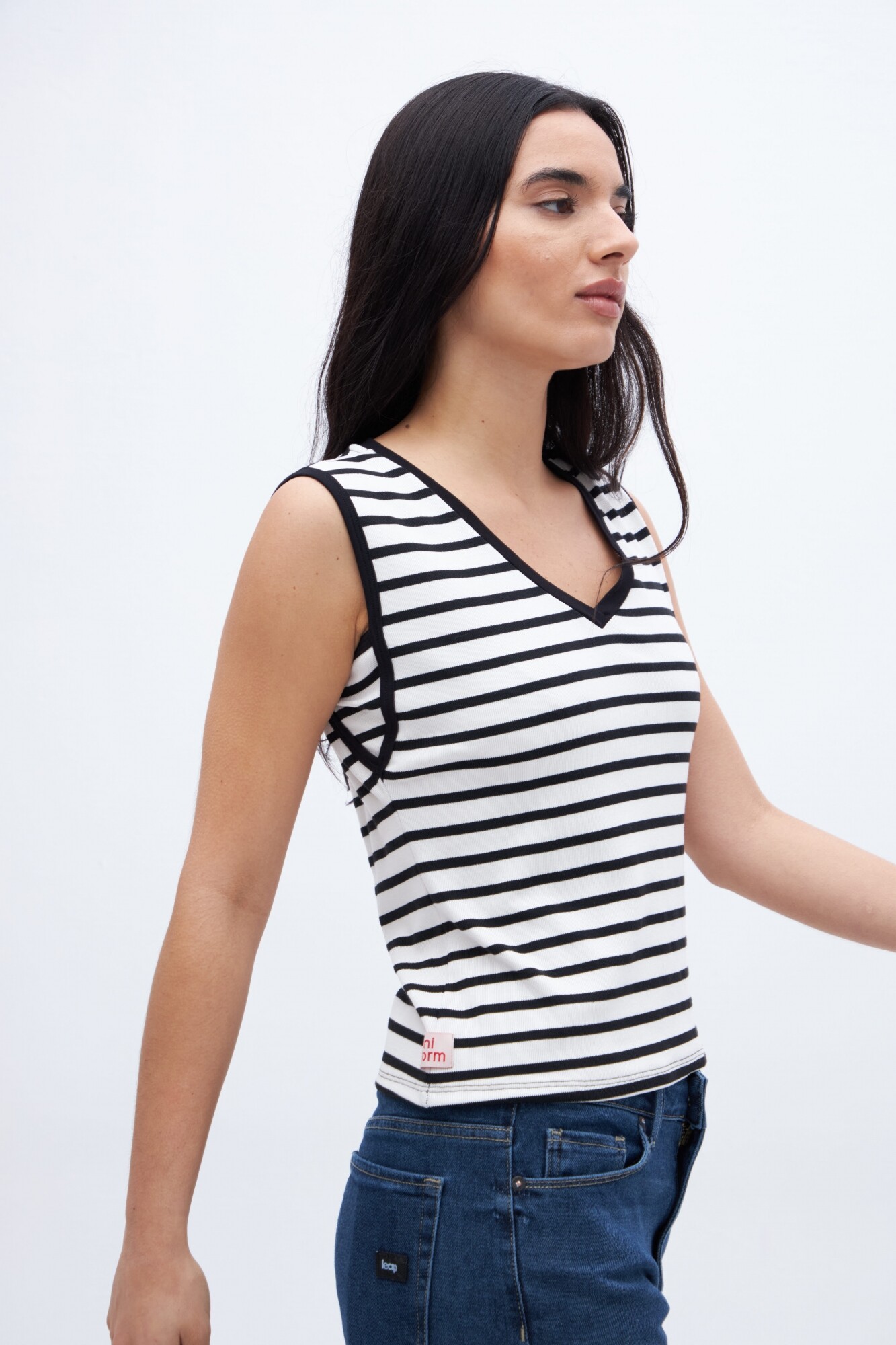 $ 973Musculosa escote en V confeccionada en tela rib rayada.