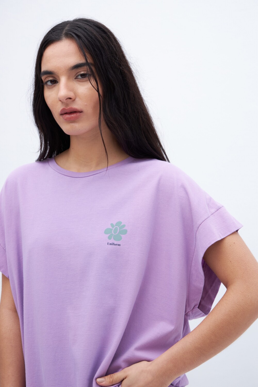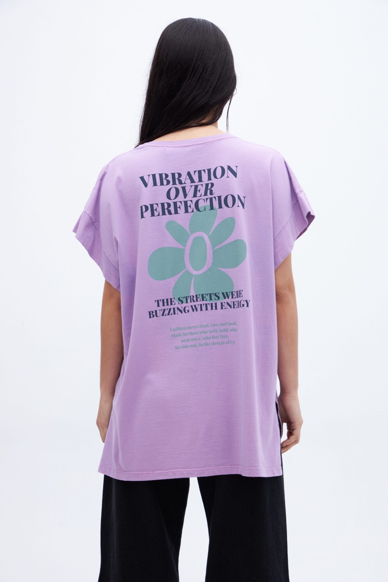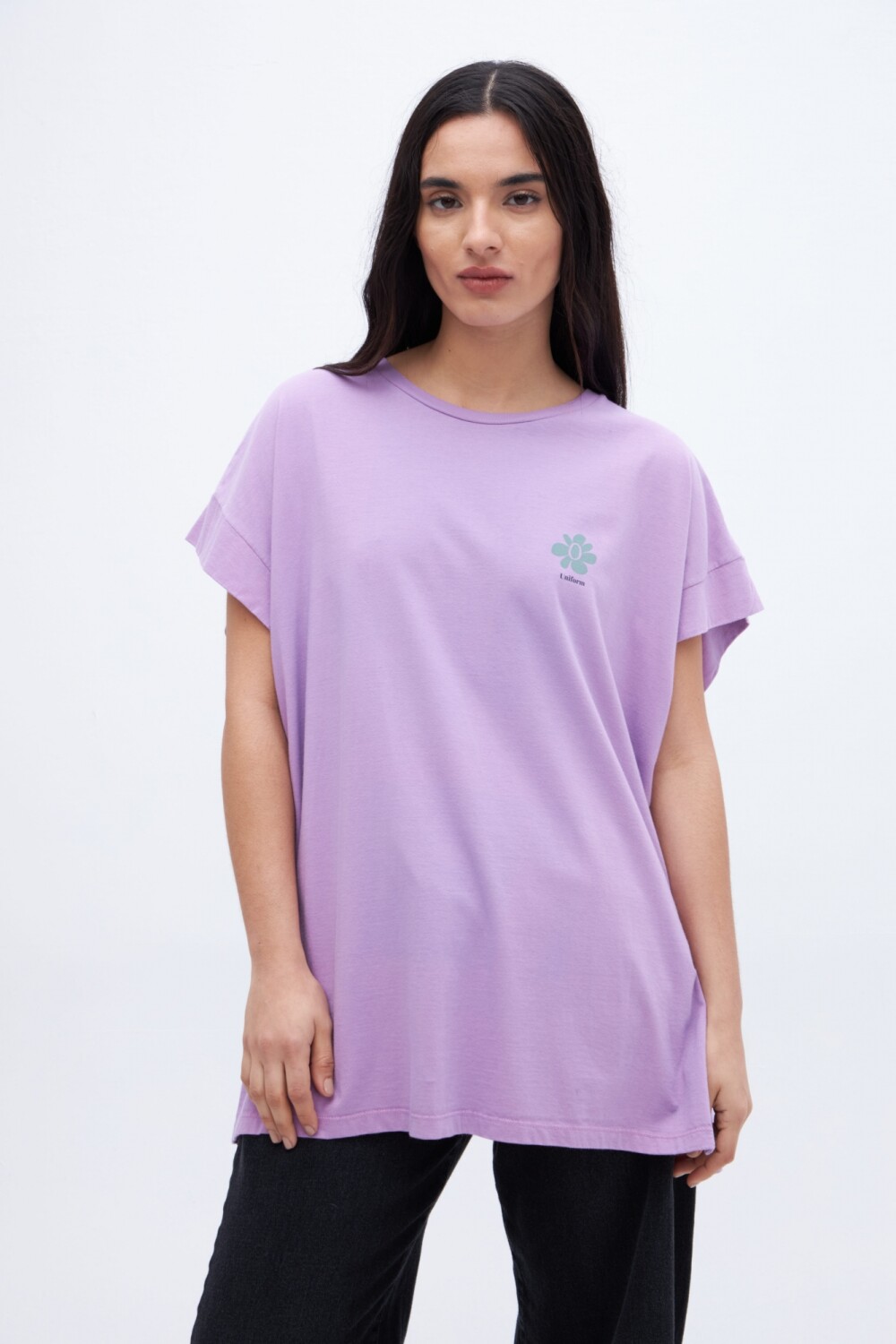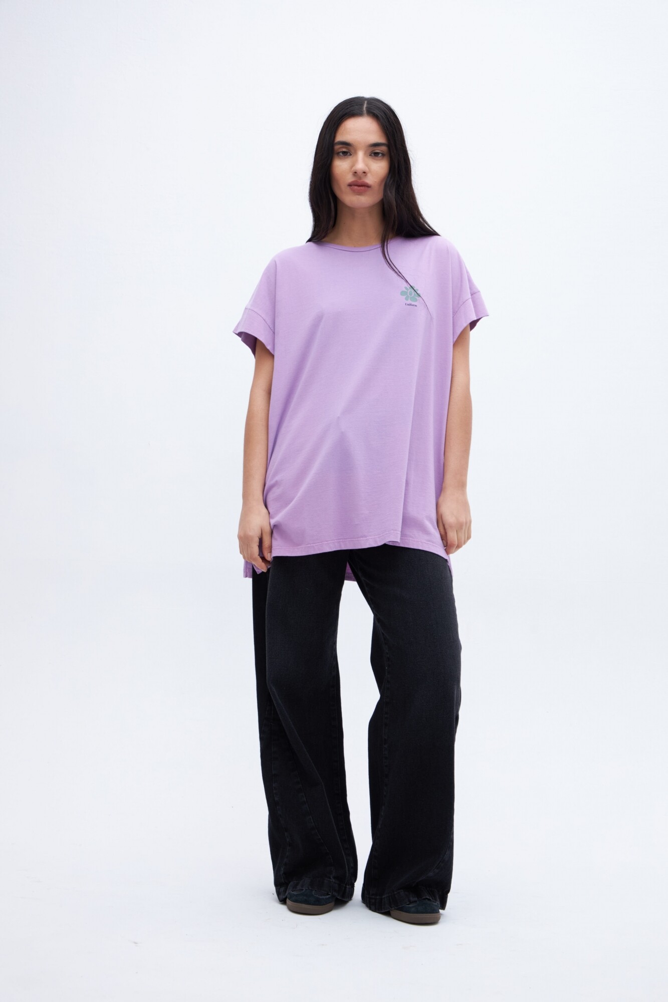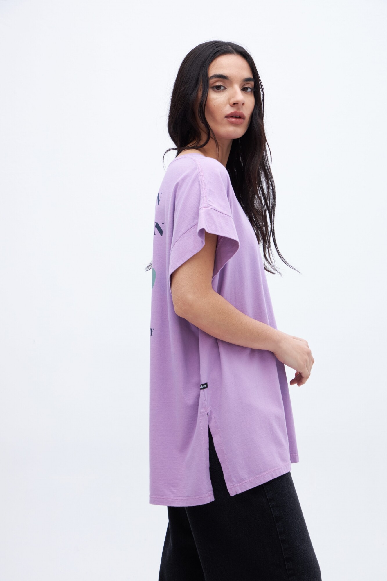 Musculosa con manguitas diferenciadas y tajos laterales. Arte en pecho y espalda. Algodón lavado con textura extra suave. Calce oversize.